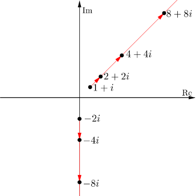 앞서 실수열의 변화를 거미줄그림으로 나타내었듯이 복소수열의 변화도 그림으로 나타내면 특징을 한 눈에 알아볼 수 있다. 복소수열의 궤도를 복소평면에 나타내어보고, 그 특징에 대해 탐구해보자.