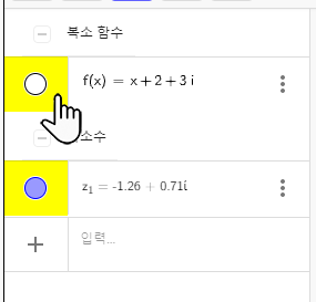 - 입력창에 다음과 같이 입력하면 복소함수 을 만들 수 있다. f(x)=x+2+3i