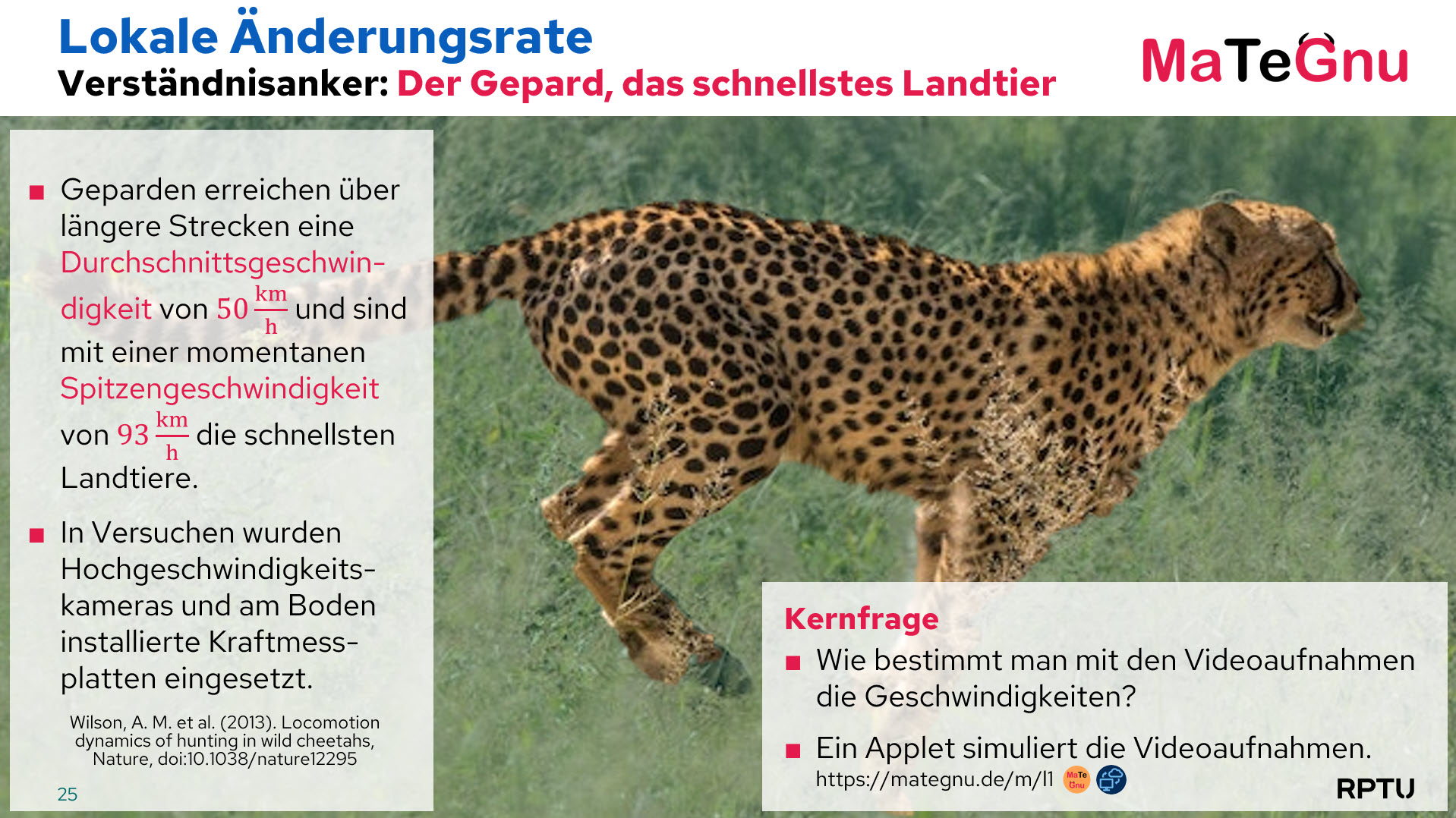 Zentral ist das Herausarbeiten der Leitfrage: Wie schnell ist der Gepard (zu einem bestimmten Zeitpunkt)?