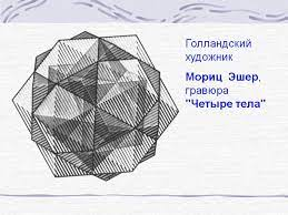 Голландский художник Маориц Корнелис Эшер создал уникальные и очаровательные работы, в которых использованы или показаны широкий круг математических идей. На гравюре "Четыре тела" Эшер изобразил пересечение основных правильных многогранников, расположенных на одной оси симметрии, кроме этого многогранники выглядят полупрозрачными, и сквозь любой из них можно увидеть остальные.