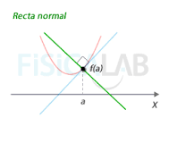 La recta normal a una función en un punto, por su parte, es la que pasa por dicho punto y tiene pendiente -1/f'(a). En azul, la recta tangente a la función f(x), en rojo, en x=a. En verde, la recta normal a la función en el mismo punto.