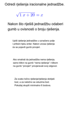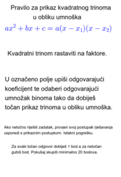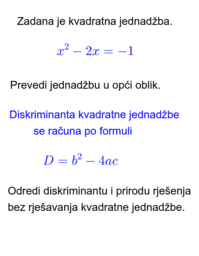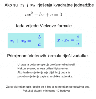 Ovim interaktivnim materijalom ćete naučiti riješiti kvadratnu jednadžbu, odrediti vrstu rješenja pomoću diskriminante te upoznati Vieteove formule. Dodatno, primjenit ćete kvadratnu jednadžbu na faktorizaciju kvadratnog trinoma te rješavanje iracionalnih i bikvadratnih jednadžbi. Rješavanjem zadataka iz apleta učenik usvaja odgojno-obrazovne ishode uz povratne informacije.